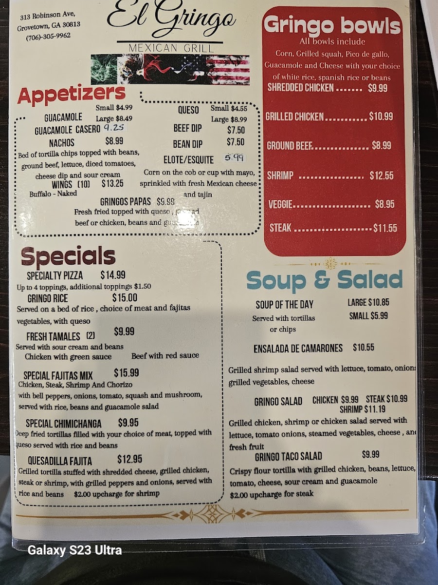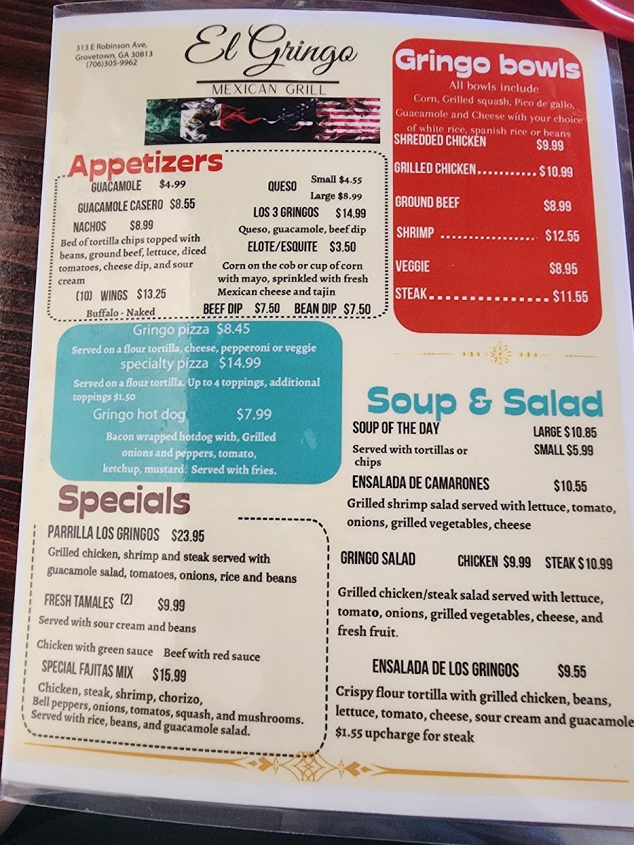 Welcome to El Gringo Mexican Grill, an authentic haven for Mexican cuisine nestled in Grovetown, GA. This inviting eatery specializes in delivering classic Mexican flavors with a contemporary twist, ensuring a memorable dining experience for all. The diverse menu features a tempting array of lunch specials, including beef burritos, enchiladas, and even delicious chile rellenos, all at an incredible value of just $9.99.